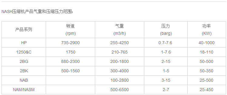 GD NASH 為世界上壓力范圍最廣、氣量最大的液環(huán)式壓縮機系統(tǒng)產(chǎn)品提供商。NASH液環(huán)壓縮機非常適宜處理有毒、腐蝕性、爆炸性氣體。在火炬氣回收、氯氣輸送、壓縮、液化和 VCM 回收等工藝上積累了豐富的經(jīng)驗并有著廣泛應用。其中NAB/NAM系列壓縮機有單級和雙級兩種結構,根據(jù)處理介質(zhì)不同可以采用鑄鐵、不銹鋼、鑄鋼、球鐵、316不銹鋼、復合不銹鋼、哈氏合金或鈦材制造。 NASH NAB/NAM液環(huán)壓縮機具有以下特點及優(yōu)勢: • 雙作用的殼體:振動小、噪音低、使用壽命長 • 懸臂式設計:密封面少、安全可靠 • 錐體結構:高的效率、高的排出壓力(可達到1.5MPa a)、低的功率消耗 • 錐體與葉輪的間隙可水平調(diào)節(jié):避免效率下降、維修維護方便。 • 前端拆卸:維修維護方便。 • 工程化的壓縮機:保證應用中最優(yōu)的效率。 • 多種材料選擇:可靠的運行、長的使用壽命 • 優(yōu)異的性能:高的可靠性、低的運行費用、維修維護方便 14 個規(guī)格的 NAB/NAM系列壓縮機,再加上原有的NASH HP-9 壓縮機,構成了 GD NASH 的核心高壓壓縮機產(chǎn)品線。低壓壓縮機的性能可以達到 30 Psig, (氣量34,000 m3/h )或 20,000cfm ( 3Bar abs. )。